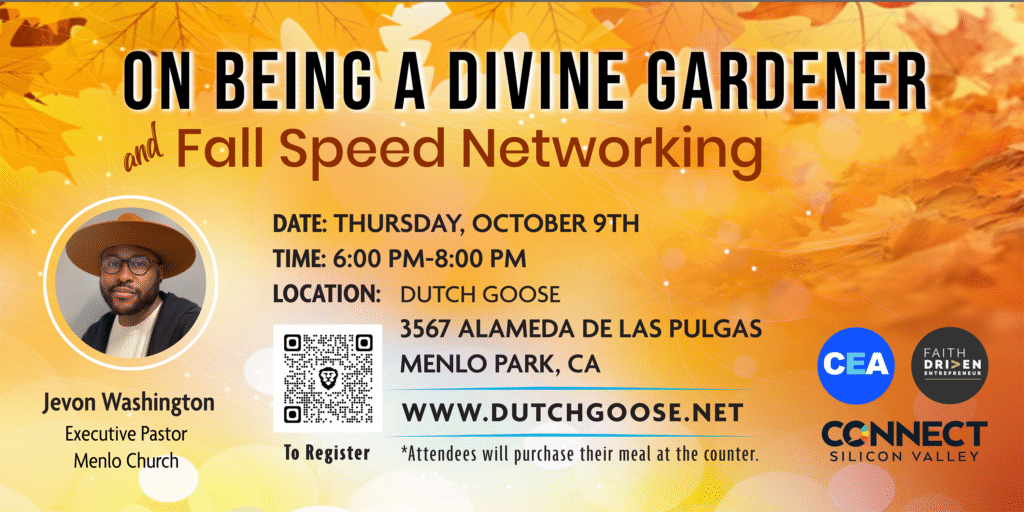 Join Jevon Washington, Executive Pastor of Menlo Church, for an inspiring evening of insight, leadership, and Fall Speed Networking. Jevon will share practical wisdom drawn from his experience in leadership, faith, and community building, offering perspective that applies to both life and work. Following his talk, enjoy Fall Speed Networking—a dynamic, fast-paced way to meet new people, build meaningful connections, and strengthen your network in a relaxed, welcoming environment.