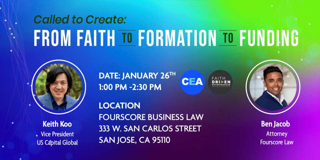 Join us for a special event designed to help entrepreneurs build with purpose and wisdom. Together, we’ll explore what it means to start a business that is both strategically sound and spiritually grounded. Attorney Ben Jacob will walk through the essentials of startup formation—covering legal structure, foundational documents, and best practices for setting your business up for long-term success. Then, investment banker Keith Koo will share a clear, high-level overview of today’s funding landscape, including common paths to capital and what investors look for in early-stage companies.